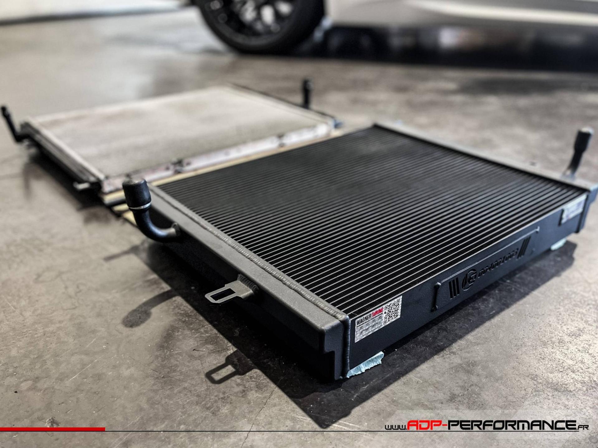 Le nouveau noyau de compétition du radiateur haute performance de WAGNERTUNING augmente le volume du refroidisseur d'eau de l'équipementier de 117 % au total. Le rapport calculé entre la surface de refroidissement intérieure et extérieure génère un transfert de chaleur maximal et permet en même temps un flux d'air suffisant pour les composants environnants (par exemple le radiateur du moteur) pour son propre échange de chaleur. En outre, l'utilisation d'une plus grande quantité d'eau de refroidissement permet de maintenir la température de l'ensemble du système à un niveau plus bas pendant une période plus longue.