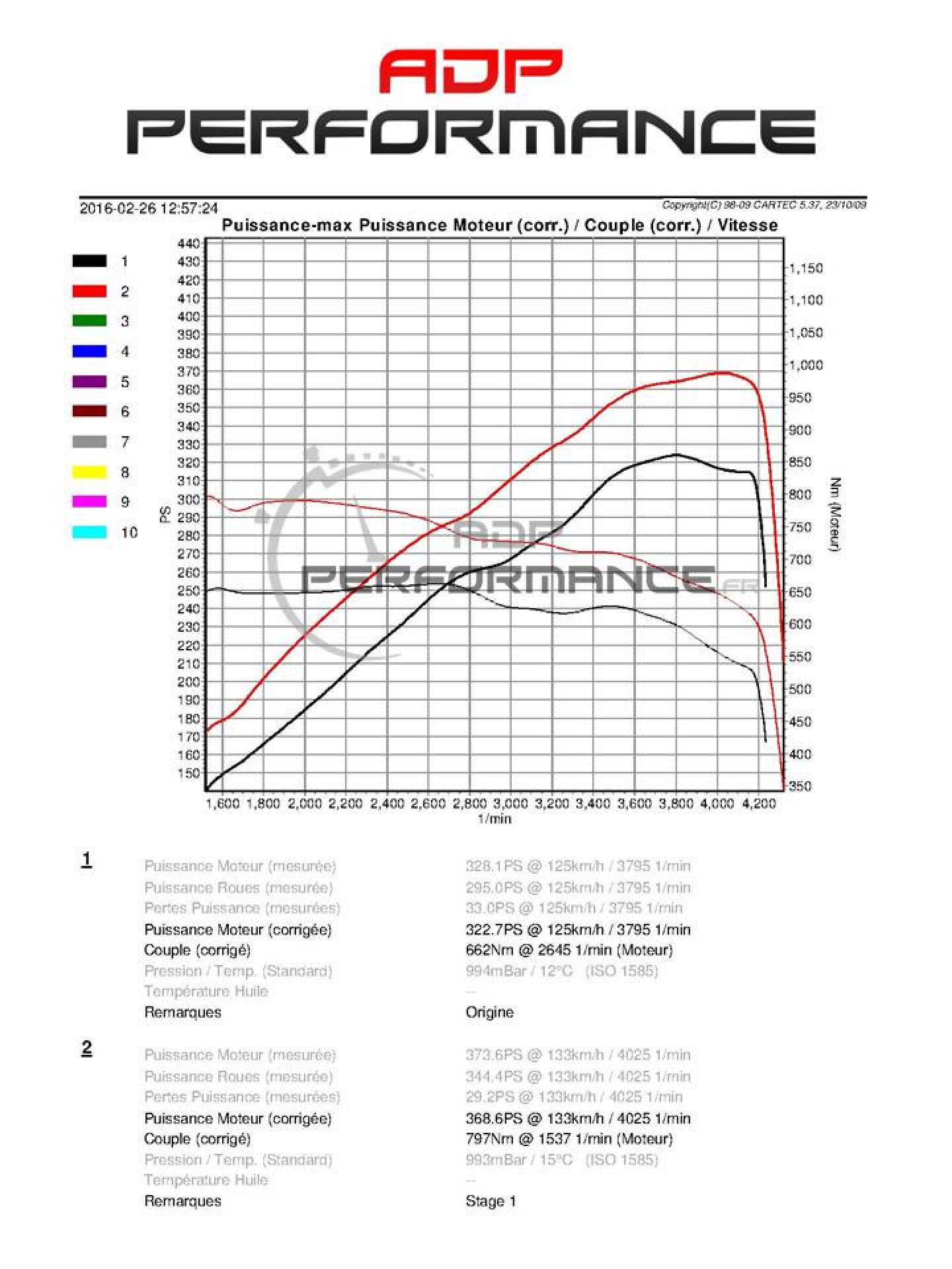 Origine : 313 PS - 650 NmRéel mesuré : 322 PS - 662 NmADP-P : 368 PS - 797 Nm