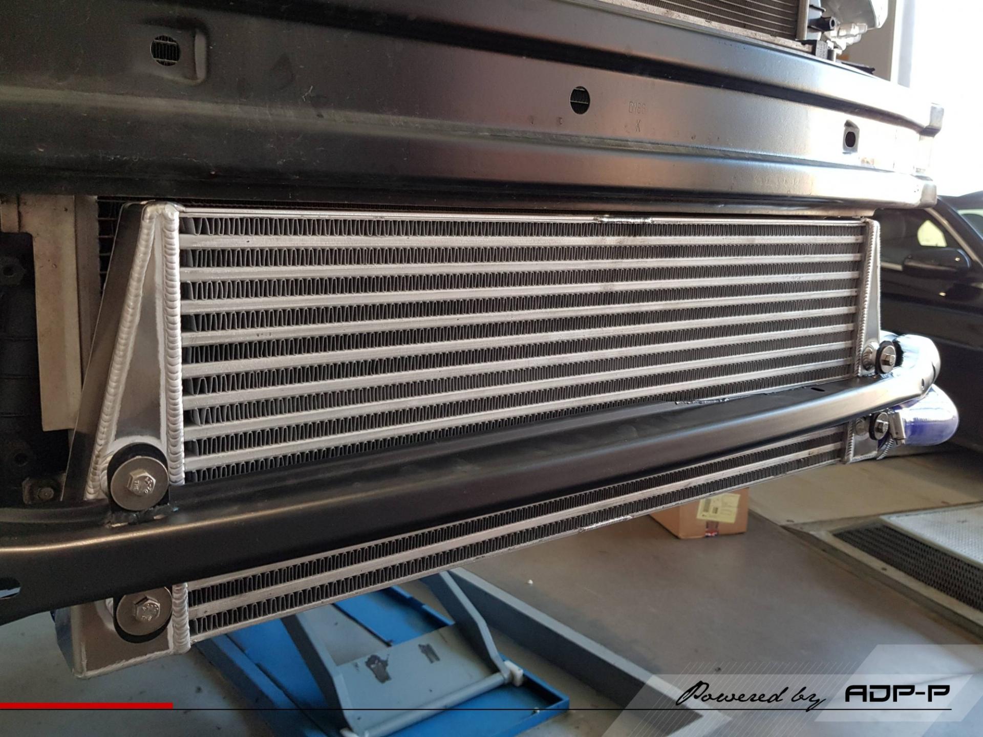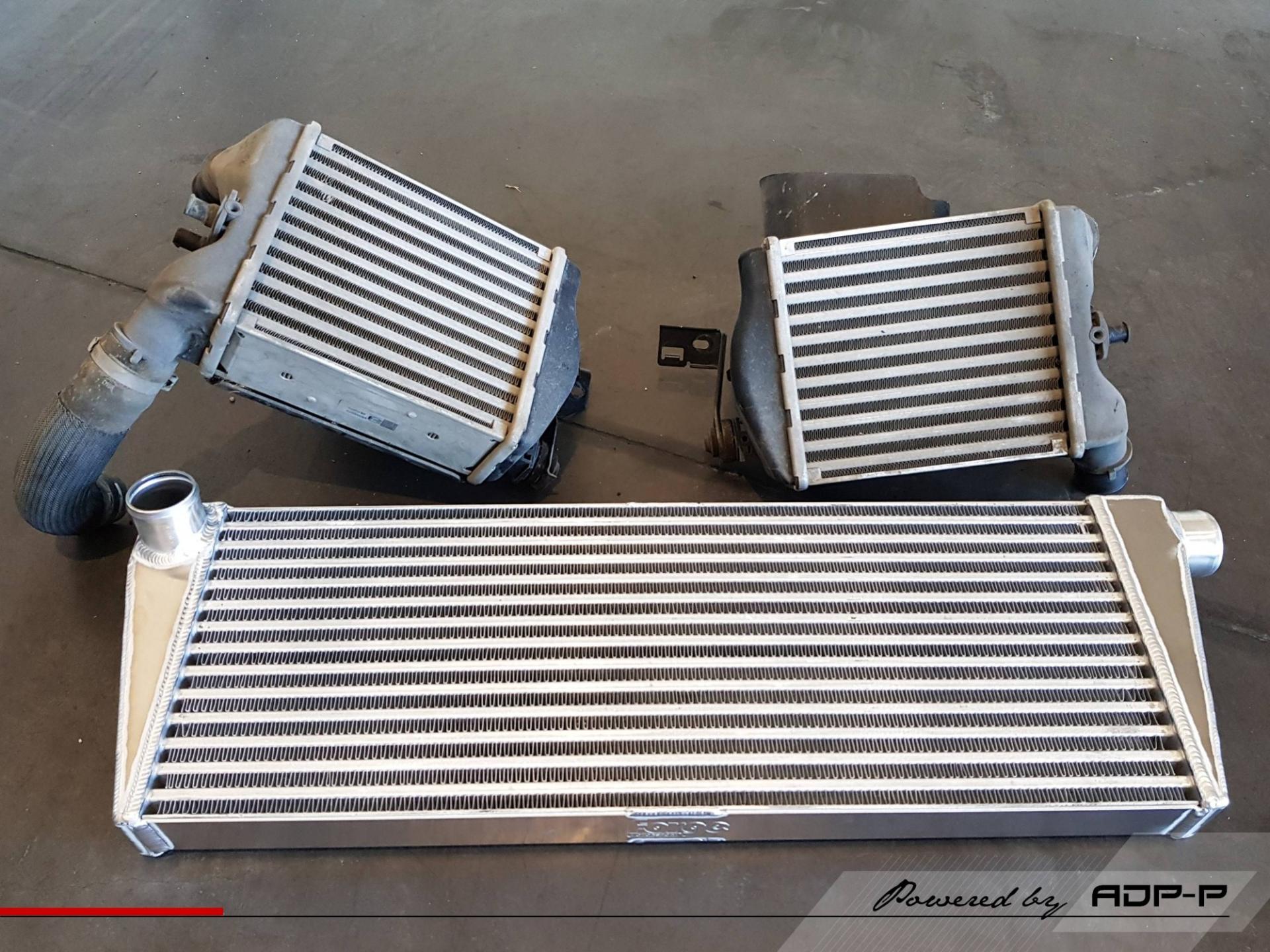 En façade, nous sommes passés de deux échangeurs latéraux de moyen volume à un gros frontal gros volume. Ce dernier à pour but de réduire les températures d'admission et donc tout en fiabilisant le véhicule nous permettre de tenir une meilleur pression de suralimentation à haut régime (sans restriction de fonctionnement liée aux temperatures elevées ou protection thermique) et d'améliorer considérablement les performances !